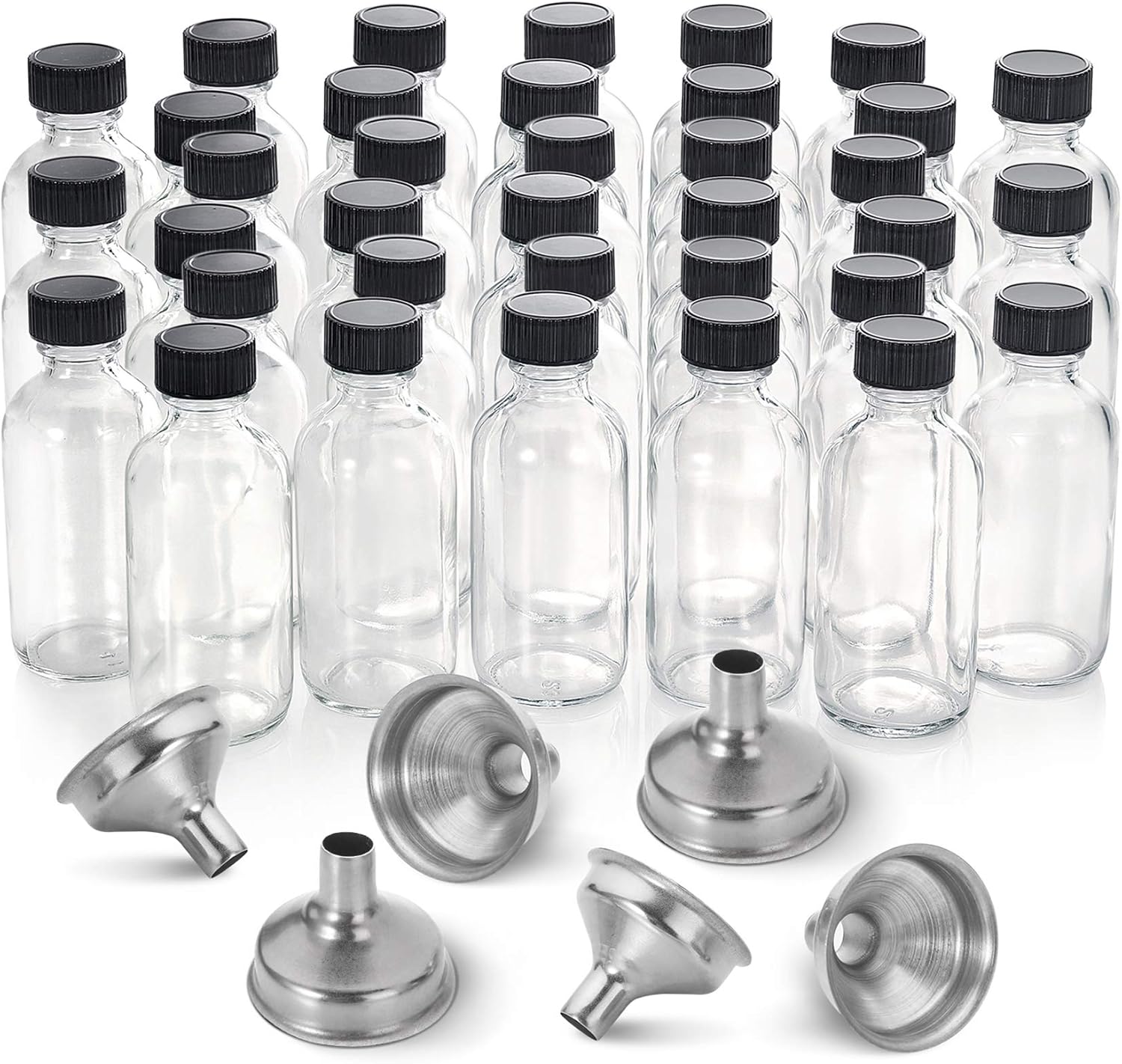 36 Pack, 2 oz Small Clear Glass Bottles w/ Lid & 6 Stainless Steel Funnels – 60ml Boston Sample Bottles – Mini Travel Essential or Decorative Bottles for Potion, Juice, Wellness, Ginger Shots, Whiskey