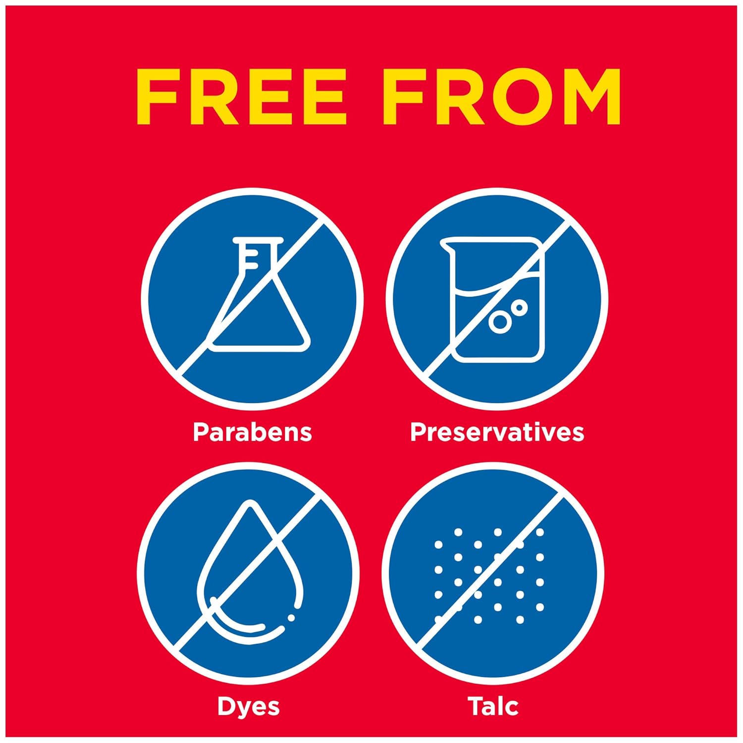 - Free from dyes, preservatives, parabens and talc
