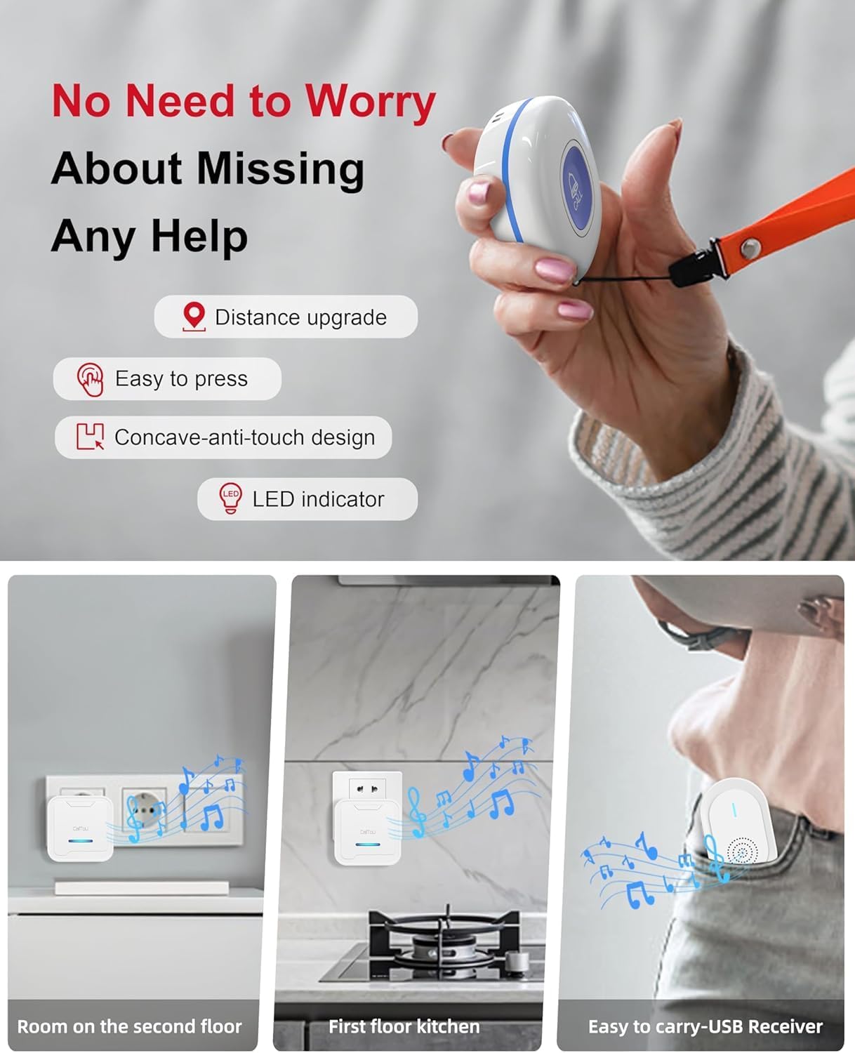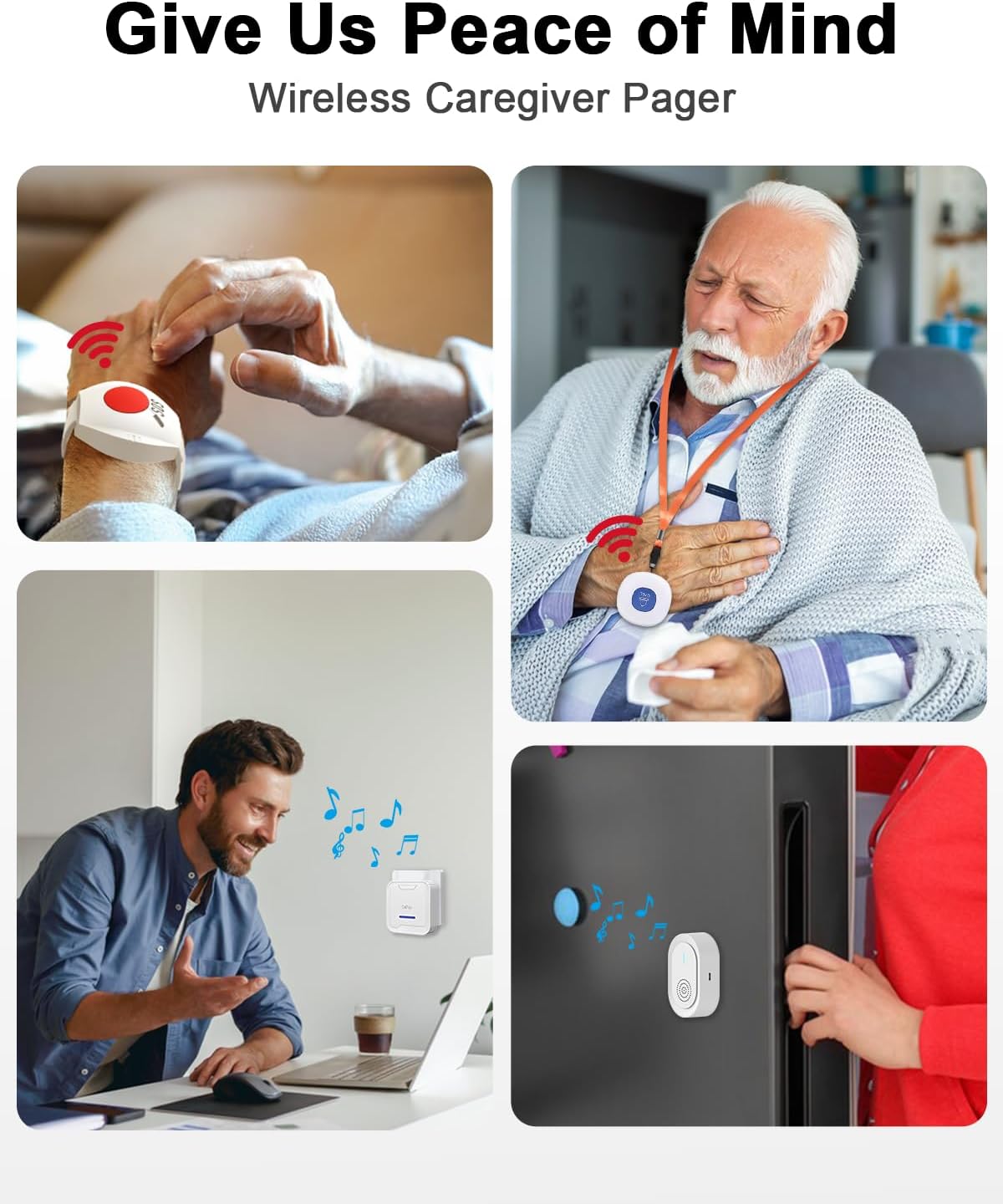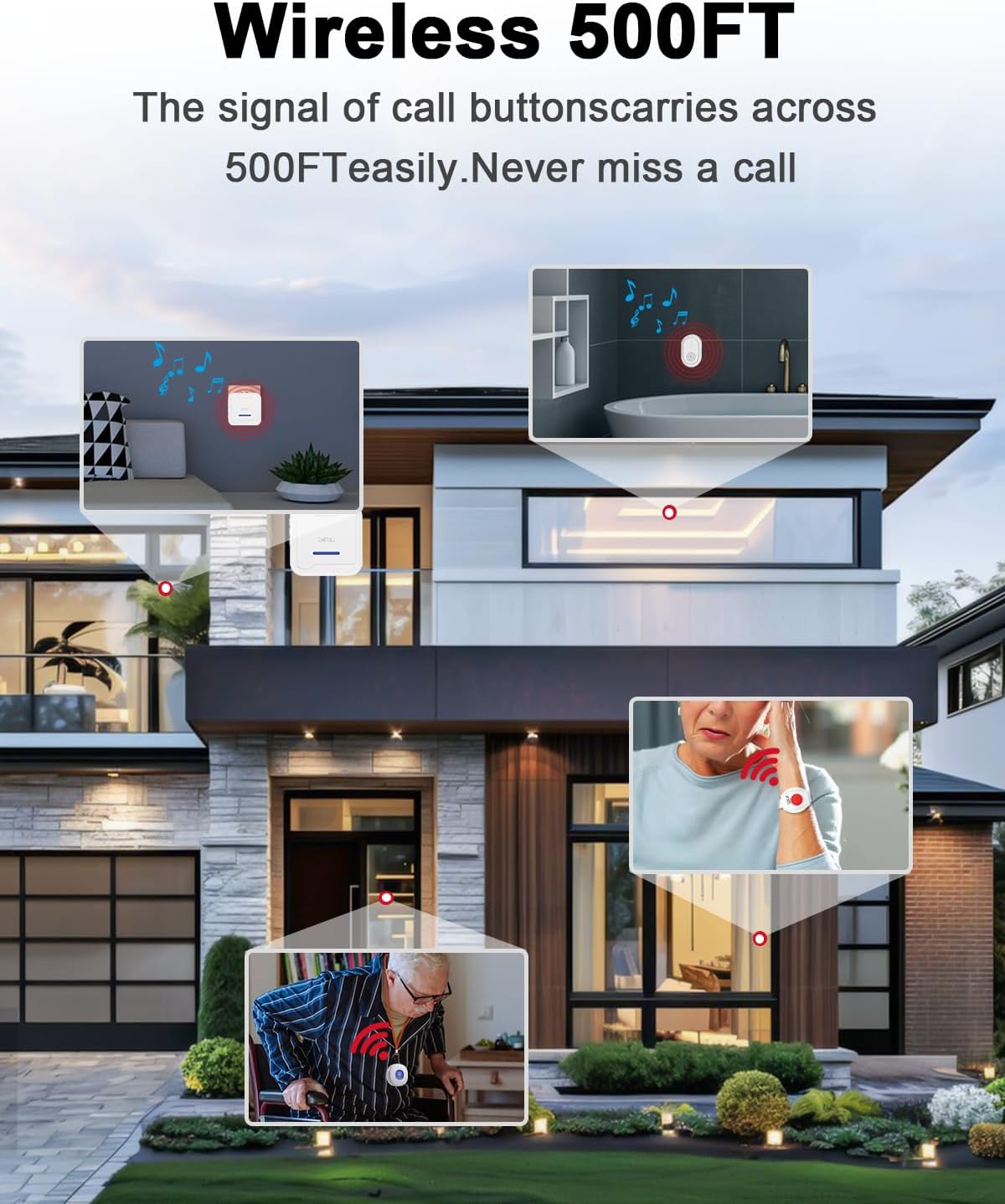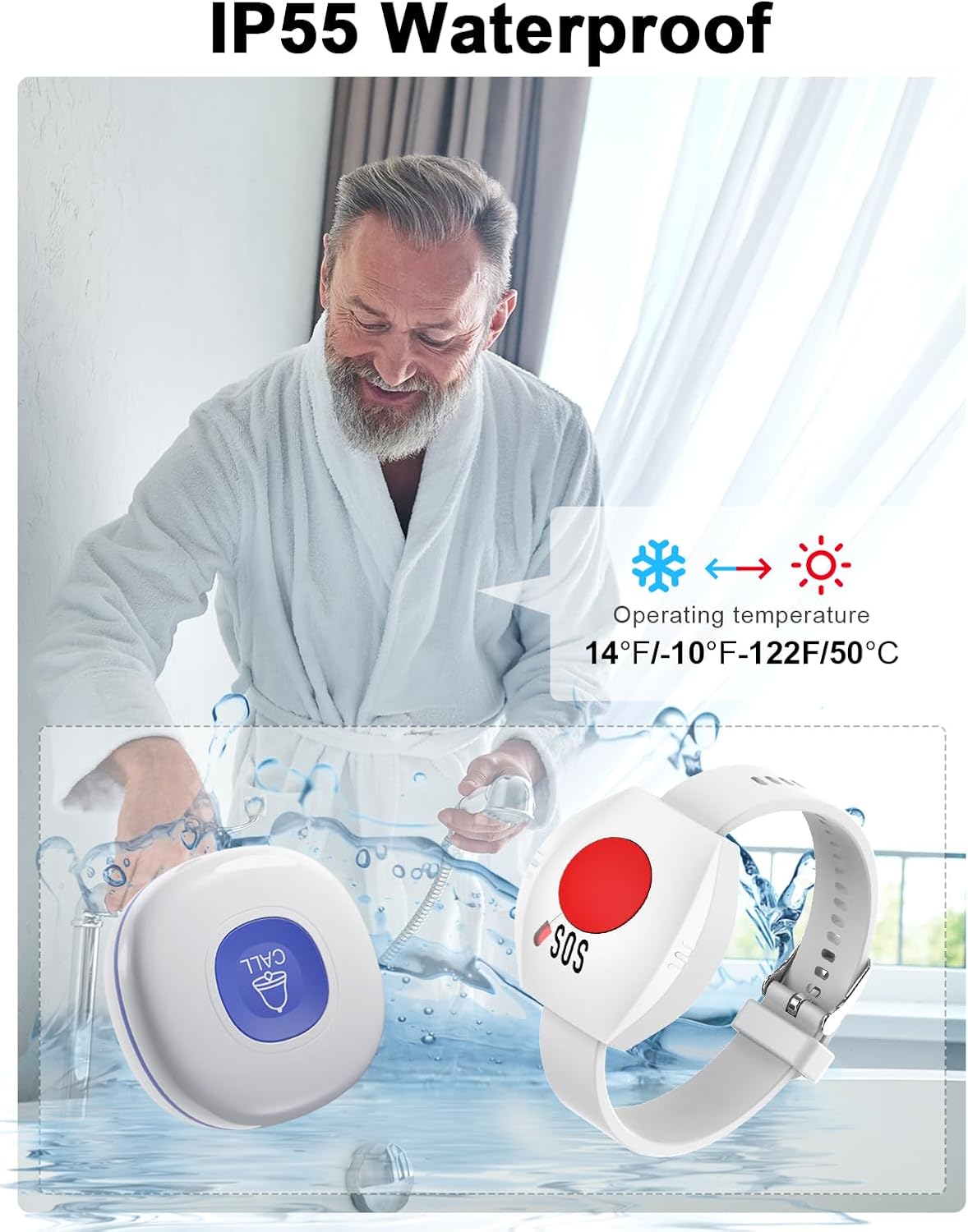 EASY TO WEAR CALL BUTTON: The wristband wireless call button is designed for seniors to wear comfortably, allowing easy access to help anytime. The another caregiver call button can be worn as a pendant or mounted near the bed or bathroom, making it a perfect personal wearable alert button for seniors at home.