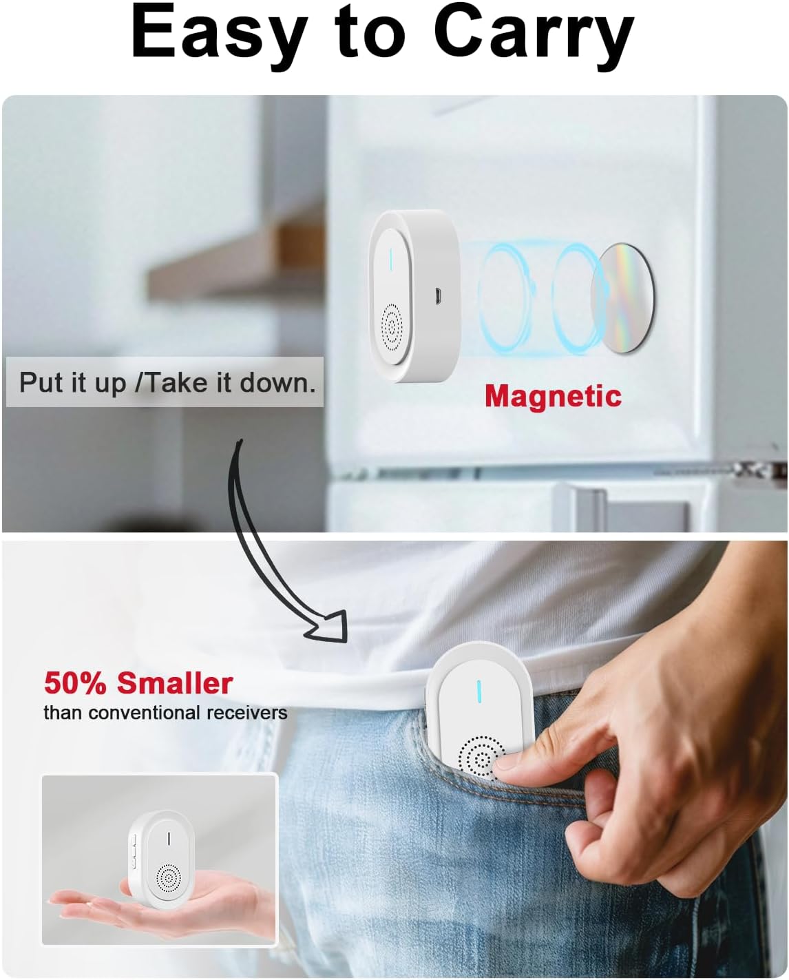 PEACE OF MIND FOR CAREGIVERS: The elderly monitoring system has a USB receiver with a magnetic sticker that attaches to the refrigerator/bedroom/kitchen/bathroom. Both the panic button for elderly and receiver can be moved with the caregiver and the open area working range is 500+ ft, you can take it to the bedroom, kitchen or yard.